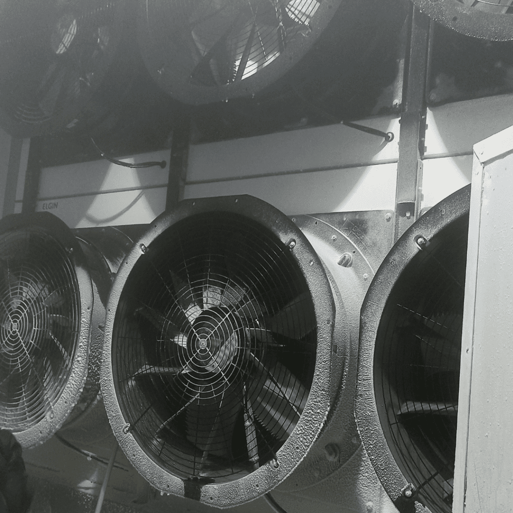 Ventiladores de alta eficiência forçam o ar frio através dos produtos.